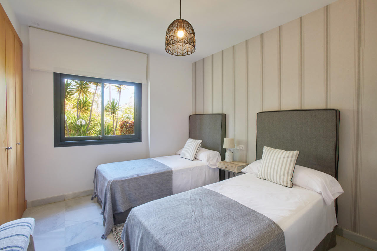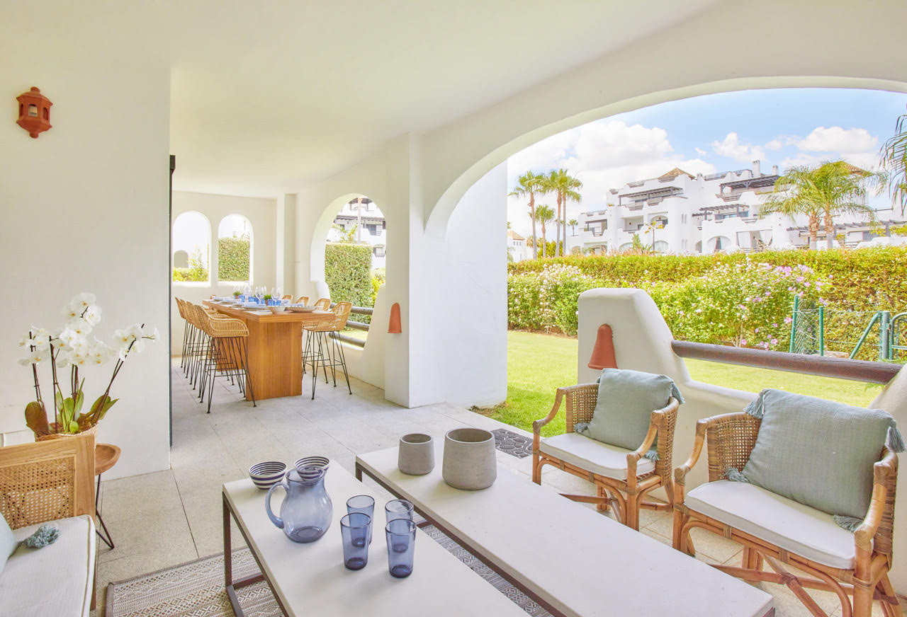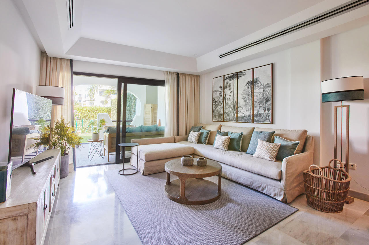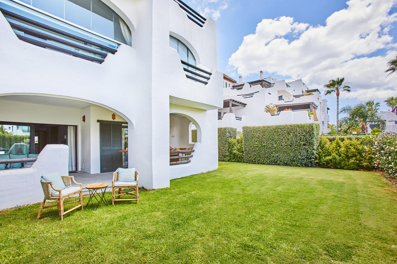Apartamento situado en la plata baja de 4 dormitorios y 3 baños. Se compone de salón/comedor con acceso a una amplia terraza y al jardín, cocina completa, 2 plazas de garaje, aire acondicionado y calefacción. Piscina comunitaria, pistas de paddle. Gimnasio. Seguridad privada.