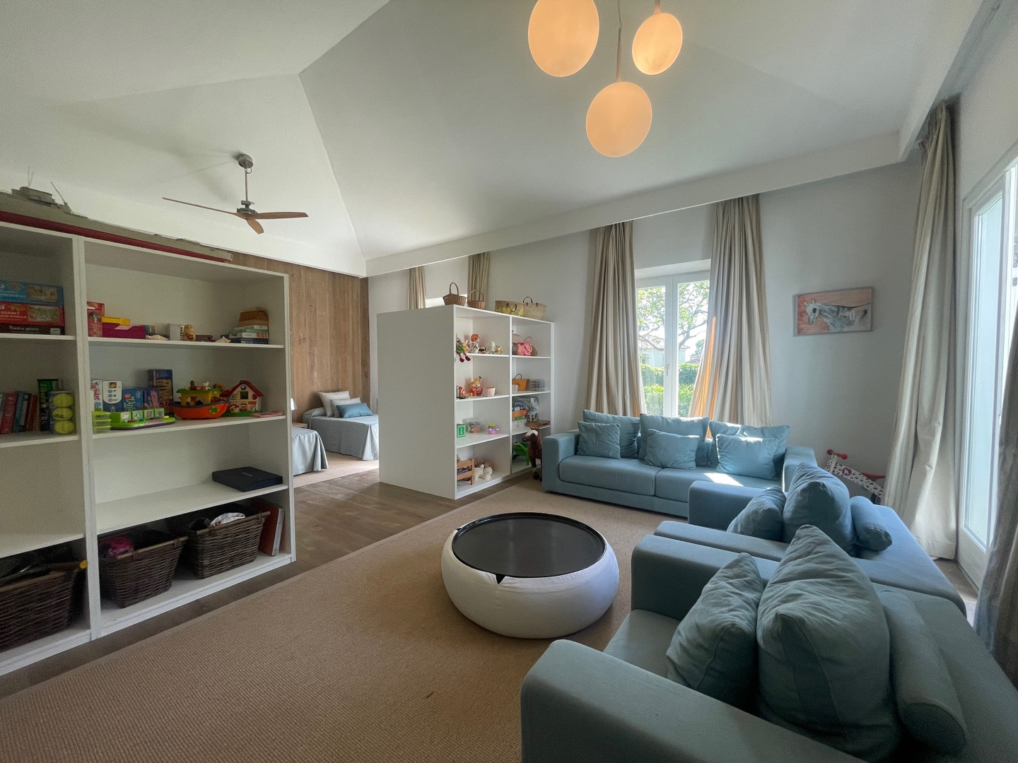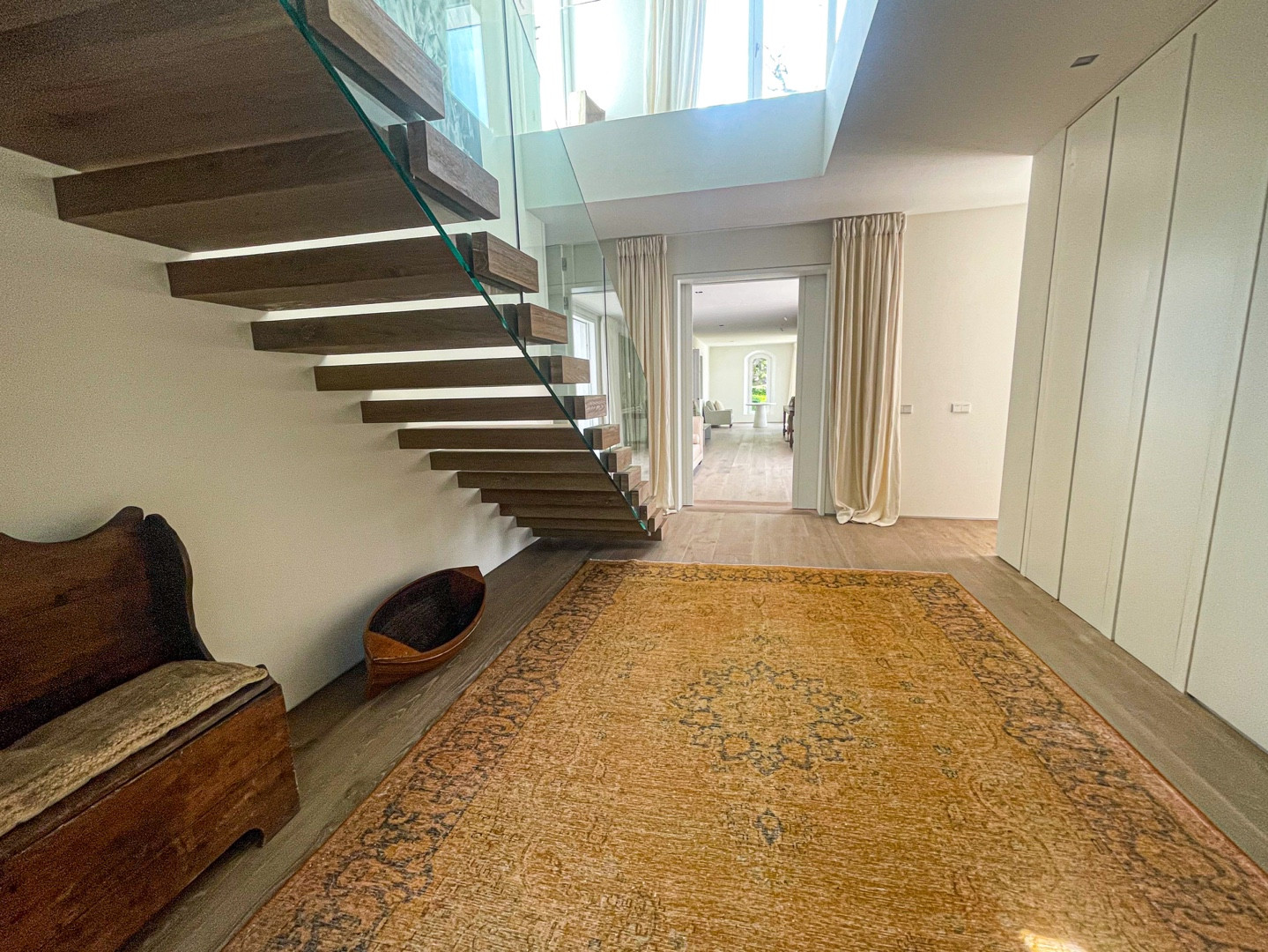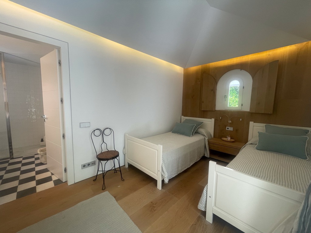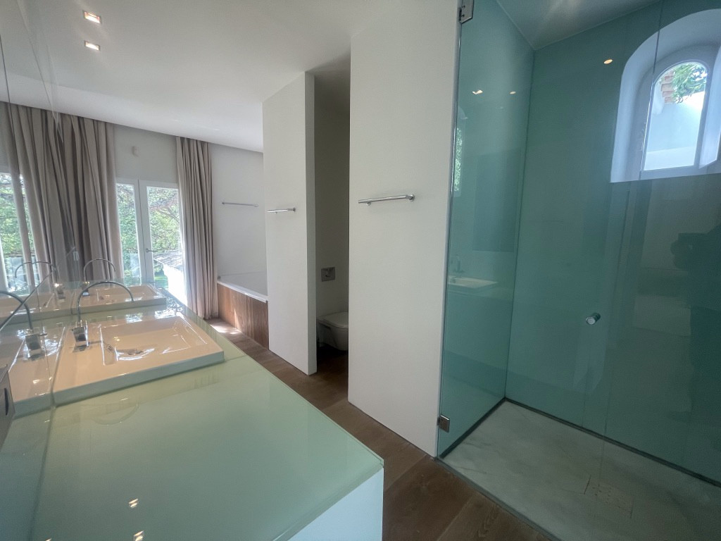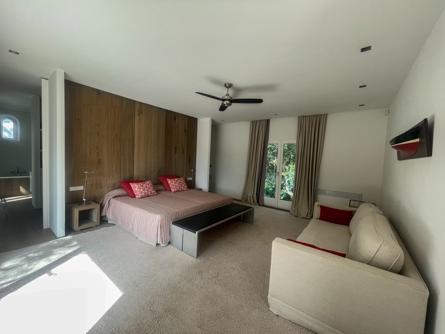 La casa está distribuida en dos plantas. En la la planta baja y desde el gran hall de entrada se distribuye toda la casa. A la derecha del hall, se encuentra un amplio salon con dos ambientes magníficamente decorados, así como el resto de la casa con acceso a grandes porches y terrazas. A continuación está el magnifico comedor independiente dando a la piscina y a. otras terrazas. Hay otro comedor más informal junto al la cocina y el office y la cocina, que está completamente equipada con varios frigoríficos y congeladores. Dispone de una zona de servicio con salón y dos dormitorio doble con cuarto de baño. Zona de lavadero. Desde el hall de entrada antes mencionado y donde hay un aseo de invitados, se accede a un dormitorio doble con cuarto de baño incluido y a continuación y a través de una galería con un patio descubierto a la derecha, a la izquierda se encuentra la zona para jóvenes que está compuesta por 2 dormitorios dobles, ambos con cuartos de baños incluidos y zonas de entretenimiento. En la planta superior encuentra la gran suite principal. También en la planta alta y con acceso desde el exterior, hay dos cuartos dos dormitorios y dos cuartos de baño con acceso a terrazas.