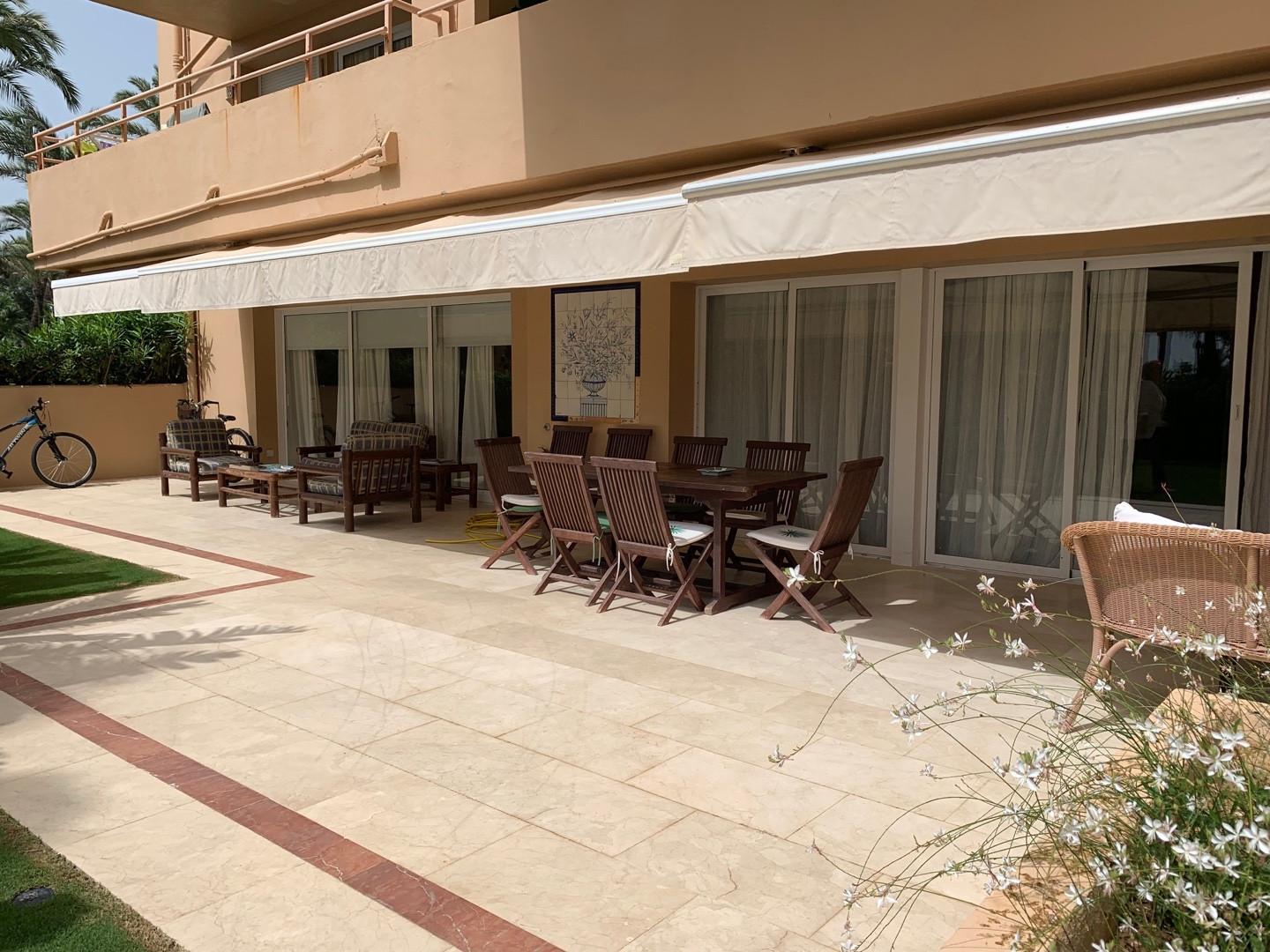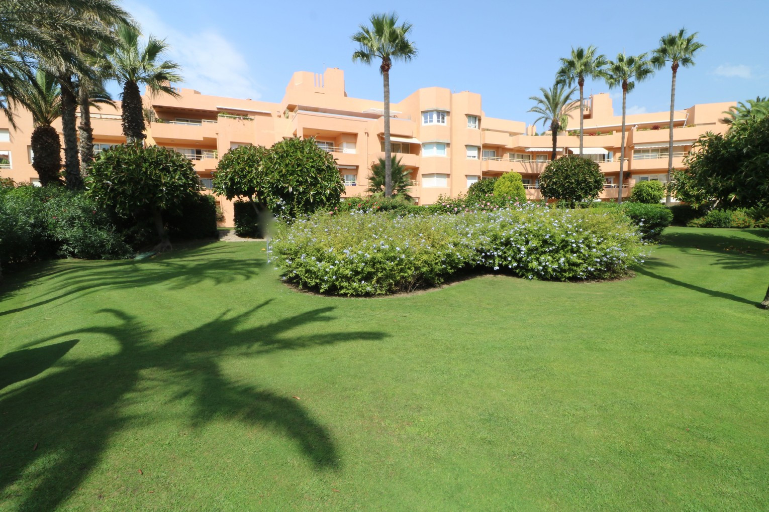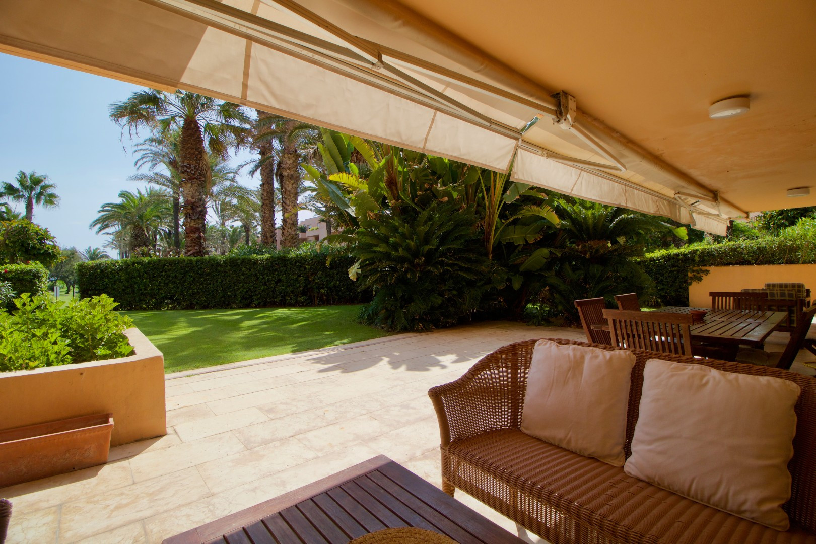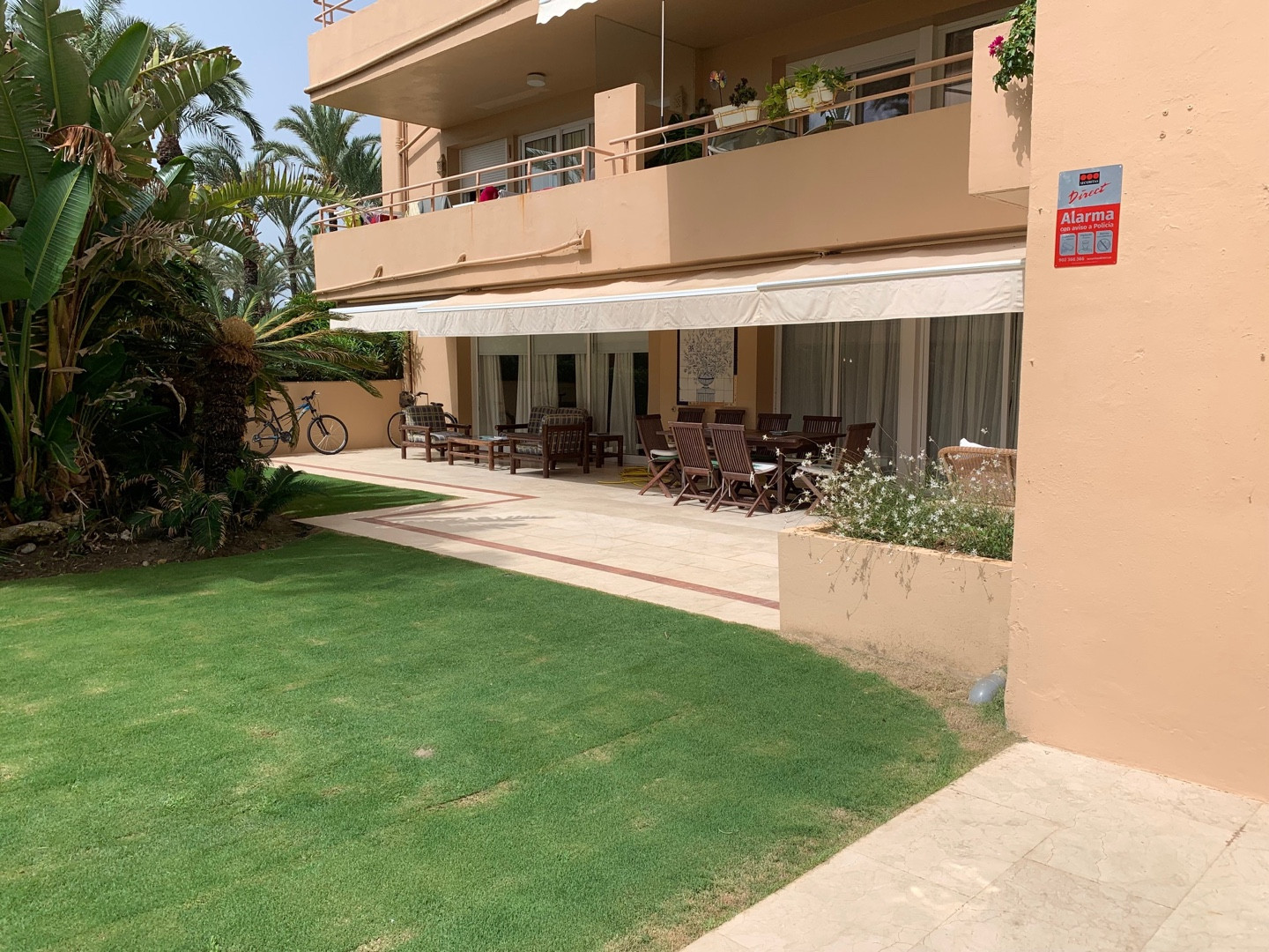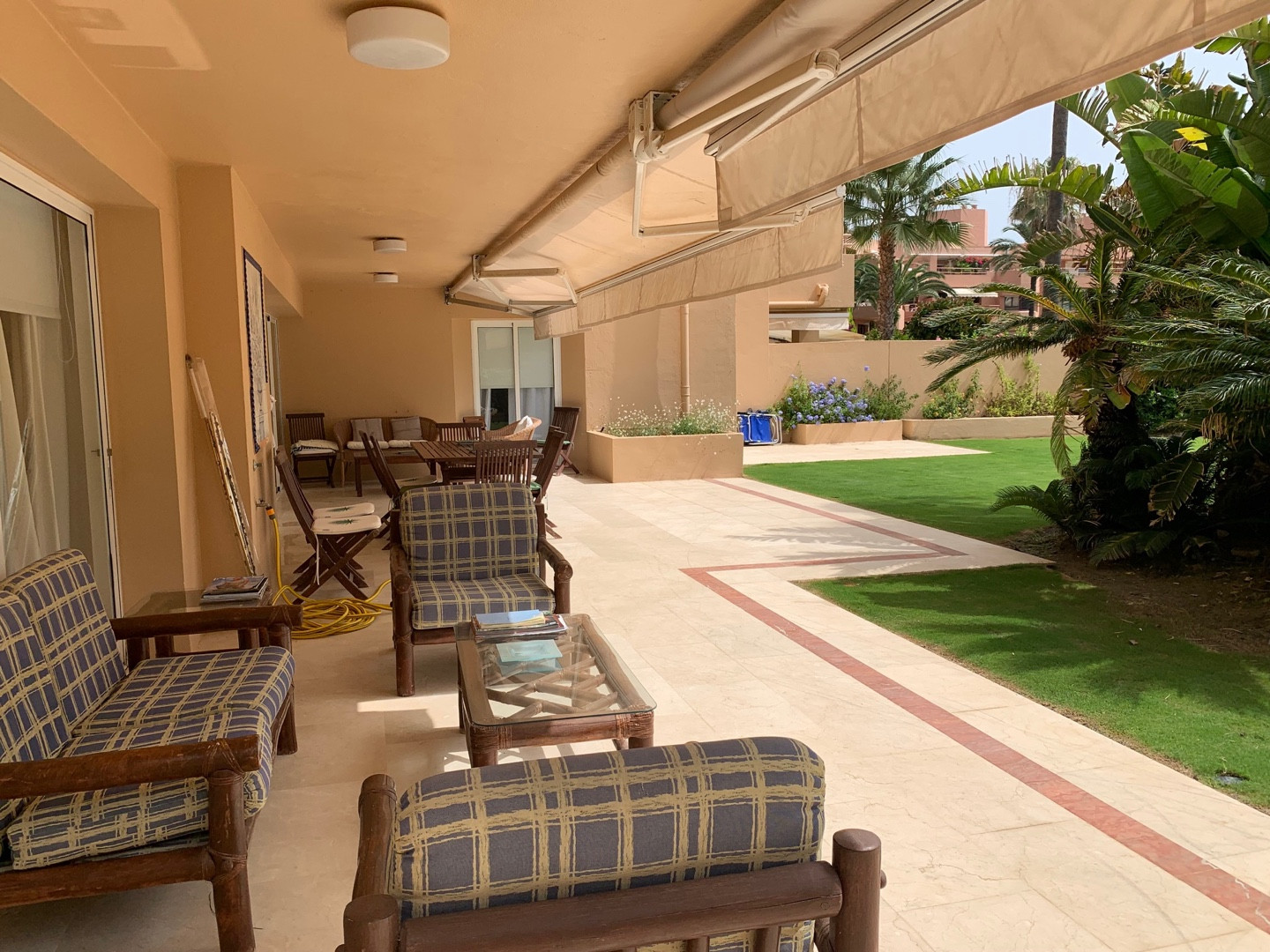 Apartamento situado en la planta baja con jardín privado orientado al sur. Consta de 4 dormitorios y 3 baños, salón comedor, cocina completa, terraza con jardín, 2 plazas de garaje. Se encuentra localizado muy cerca de la playa y a poca distancia club de playa y tenis el Octógono.