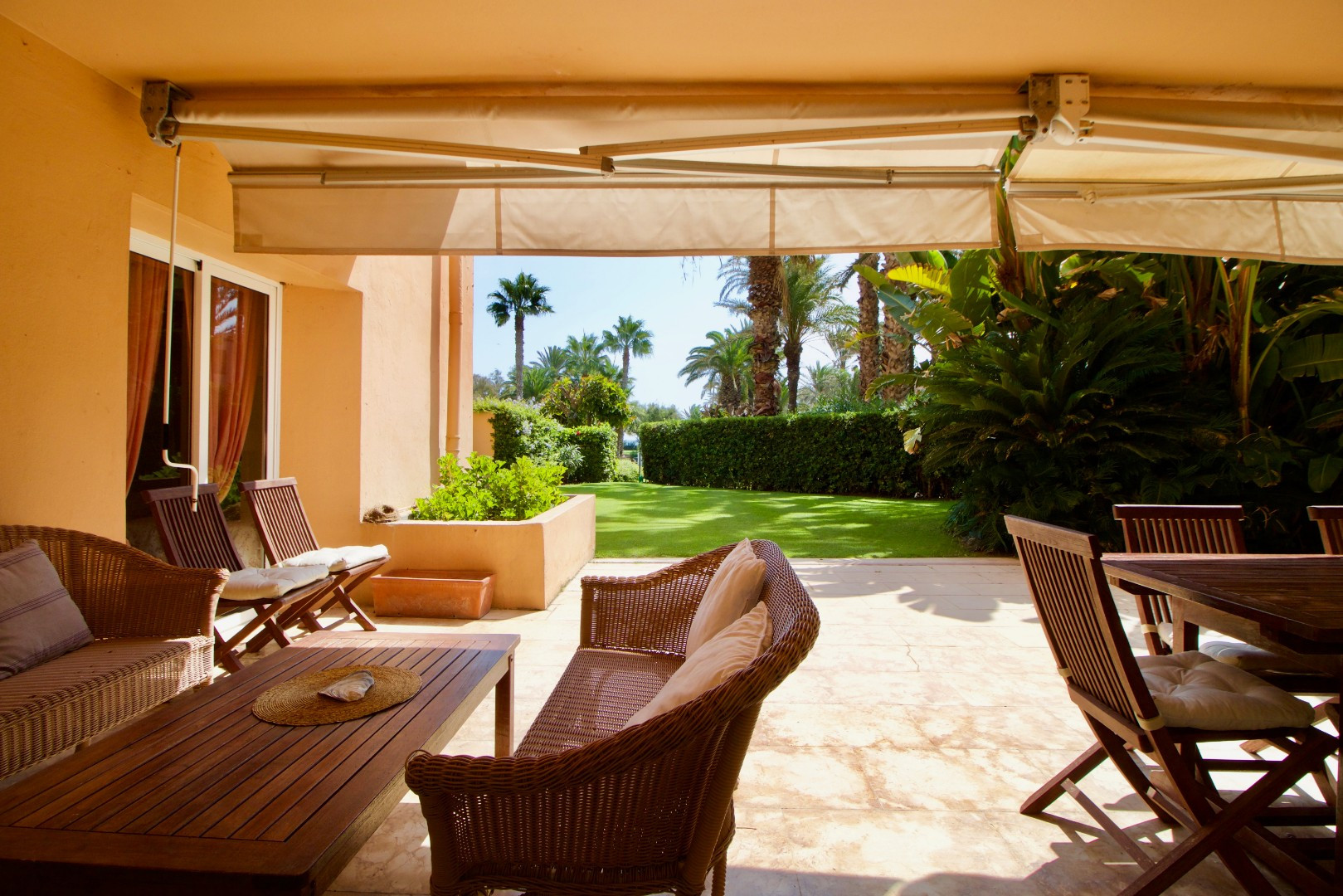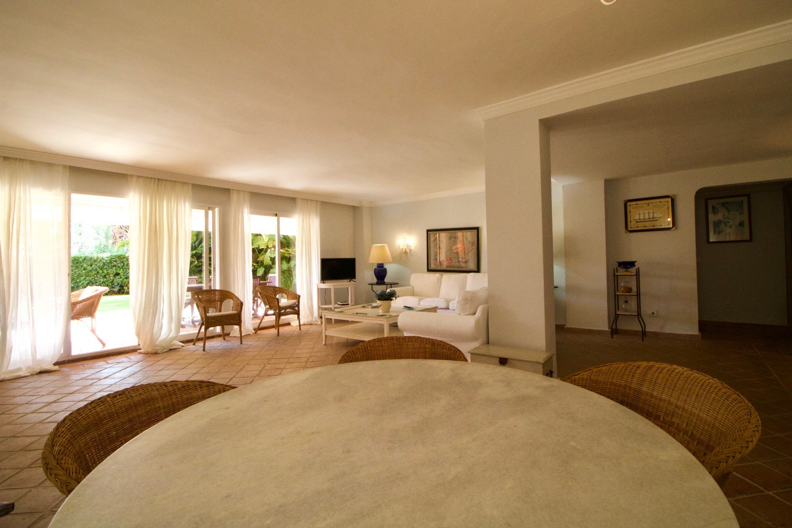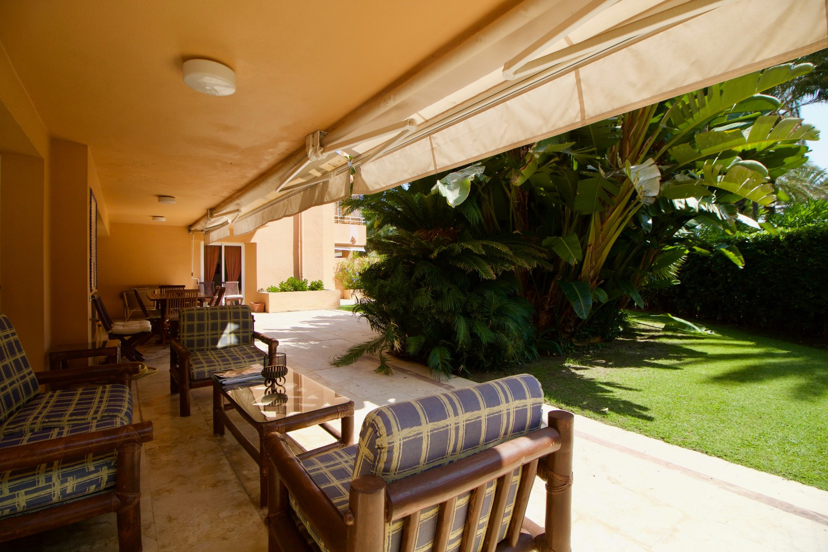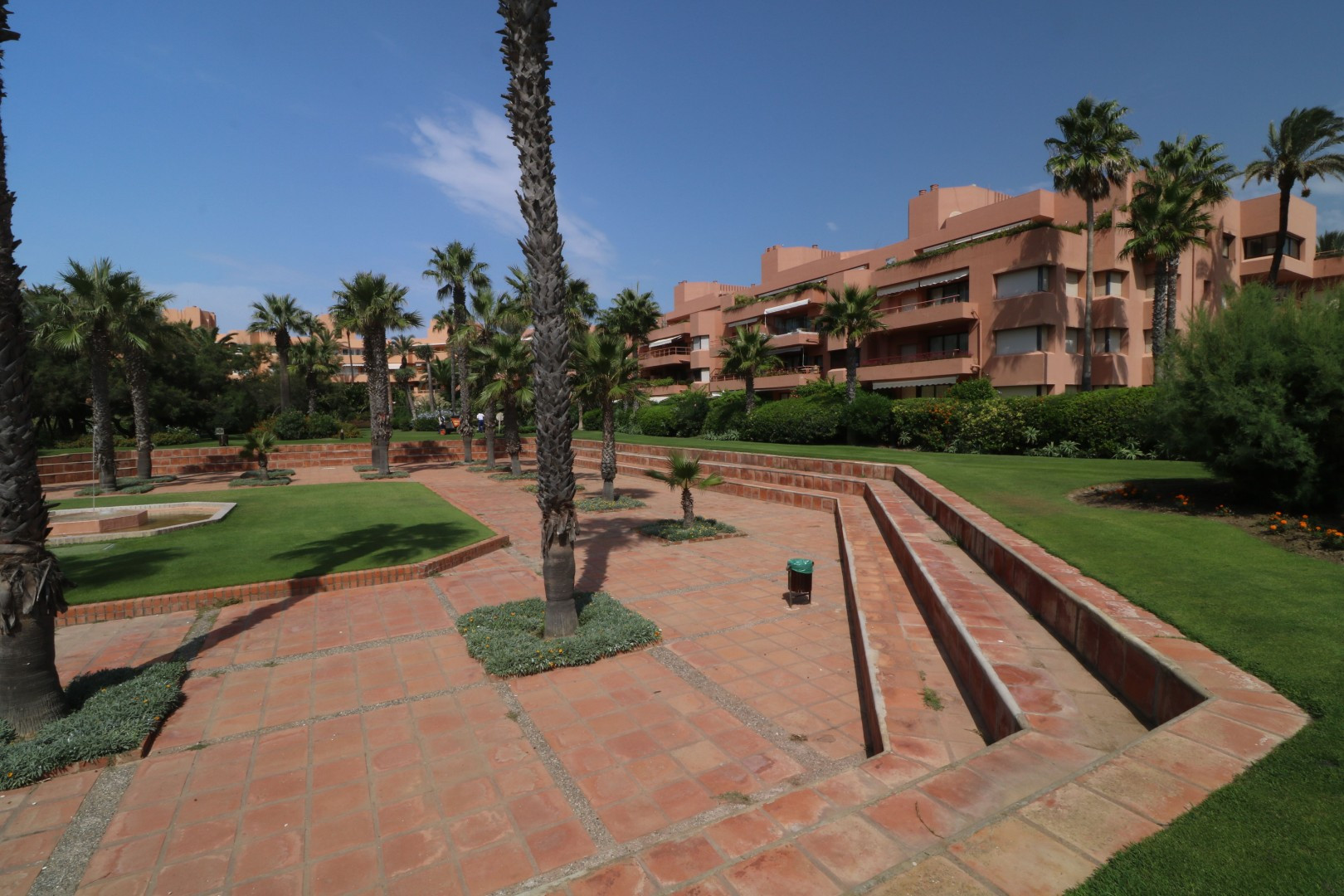 Apartamento situado en la planta baja con jardín privado orientado al sur. Consta de 4 dormitorios y 3 baños, salón comedor, cocina completa, terraza con jardín, 2 plazas de garaje. Se encuentra localizado muy cerca de la playa y a poca distancia club de playa y tenis el Octógono.
