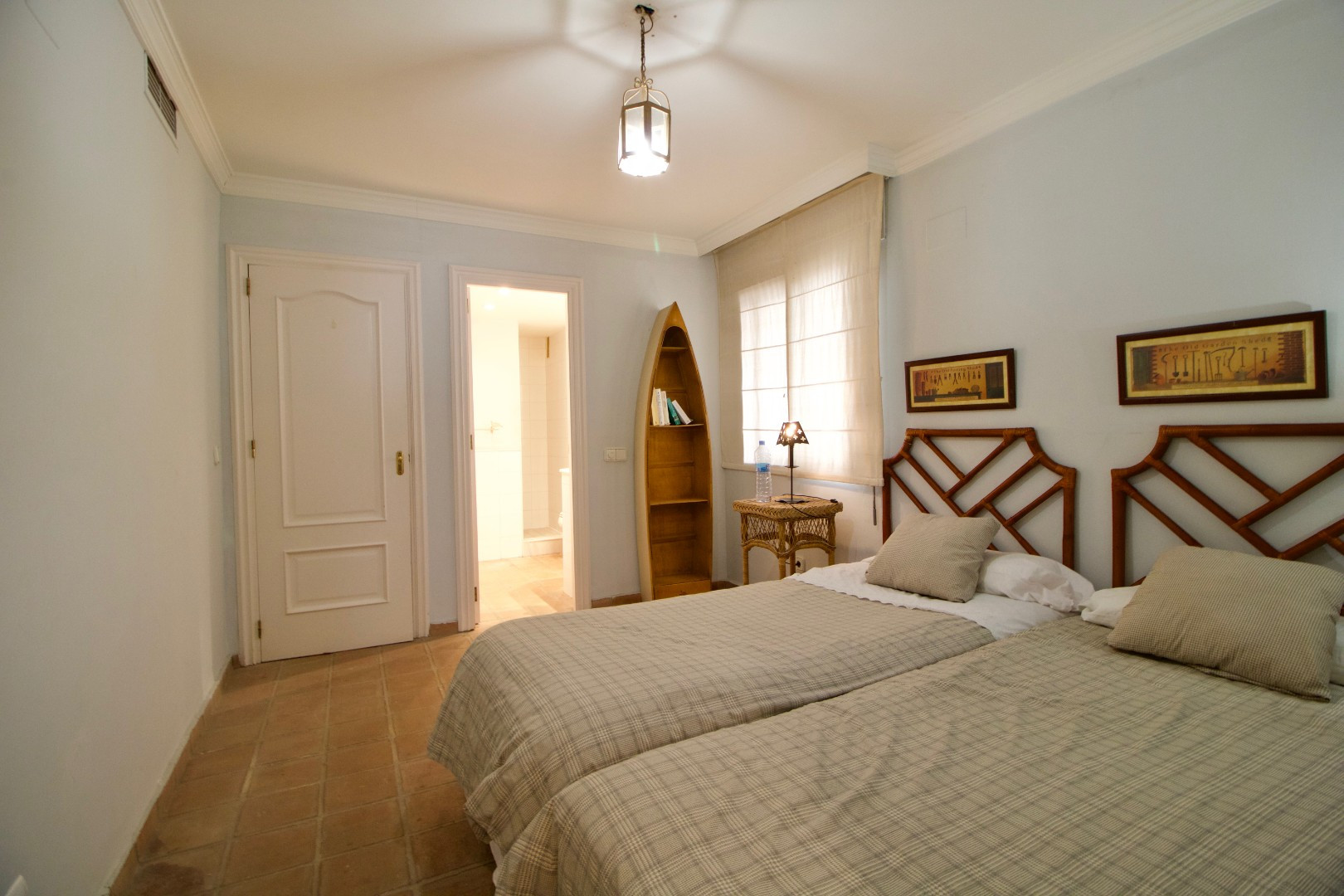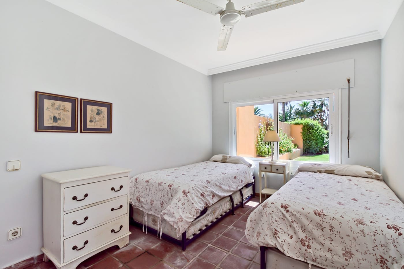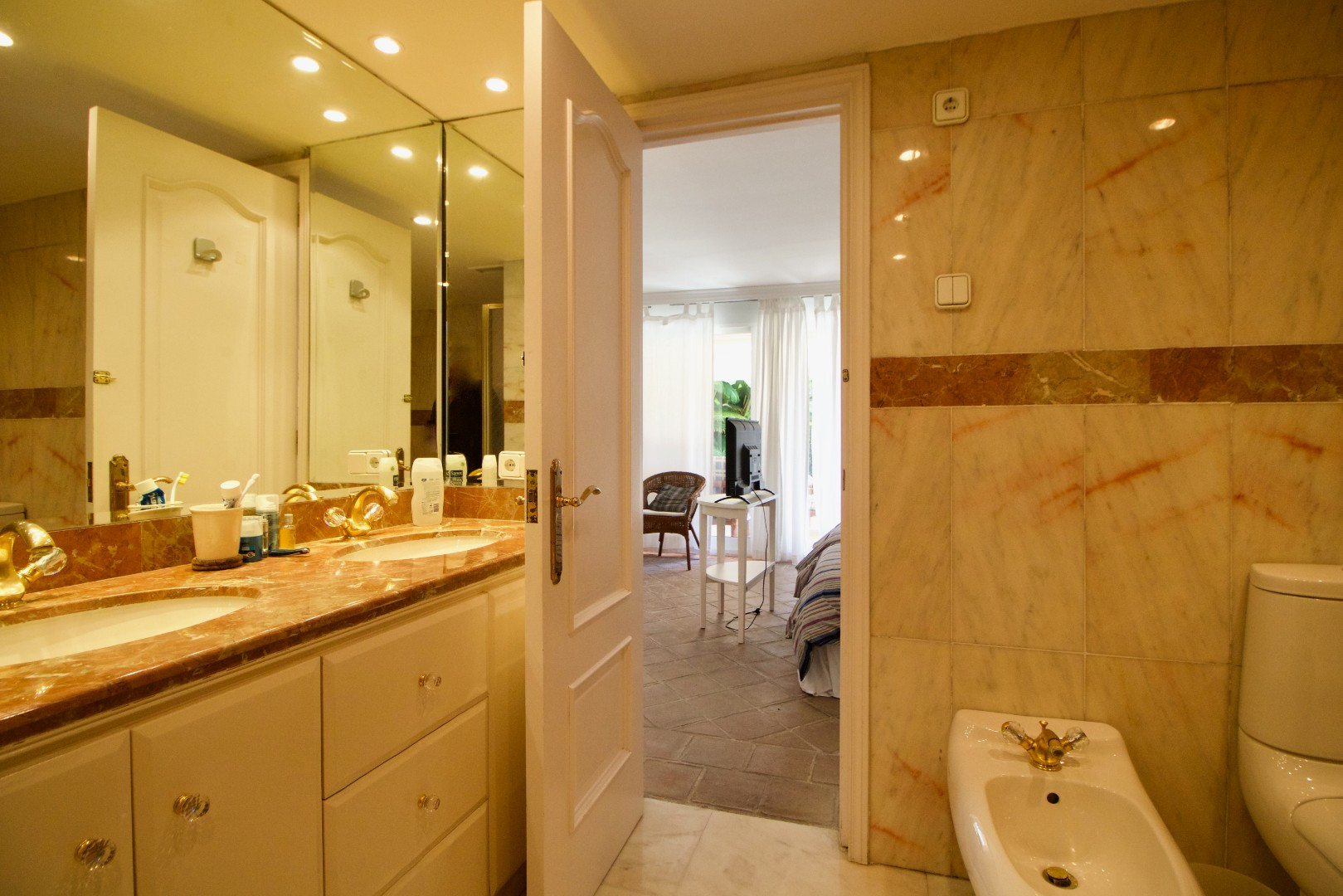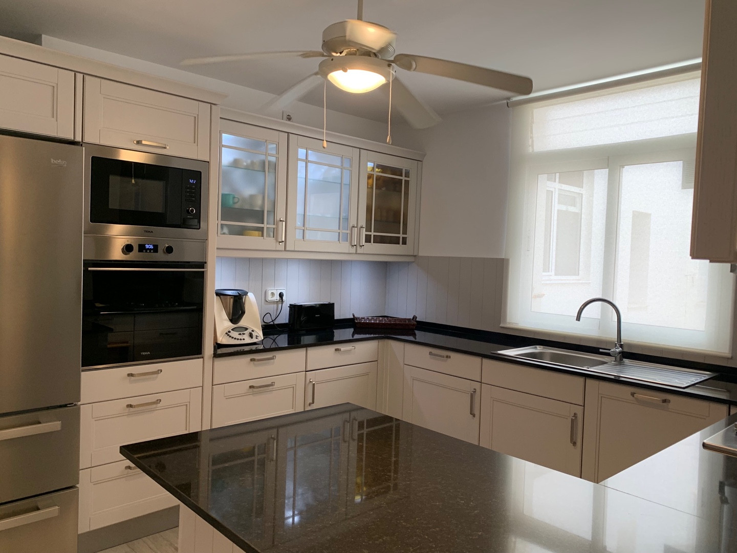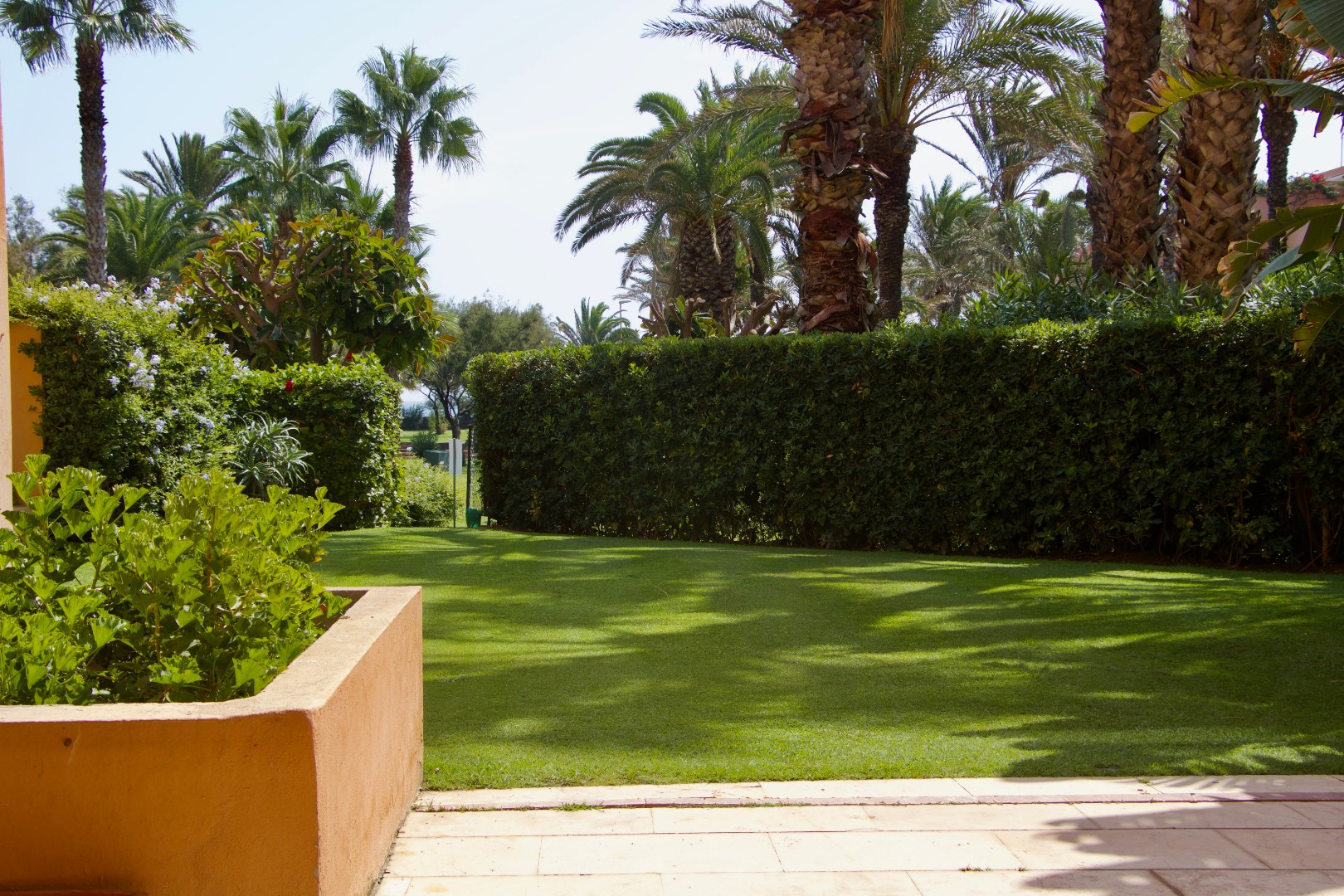 Apartamento situado en la planta baja con jardín privado orientado al sur. Consta de 4 dormitorios y 3 baños, salón comedor, cocina completa, terraza con jardín, 2 plazas de garaje. Se encuentra localizado muy cerca de la playa y a poca distancia club de playa y tenis el Octógono.